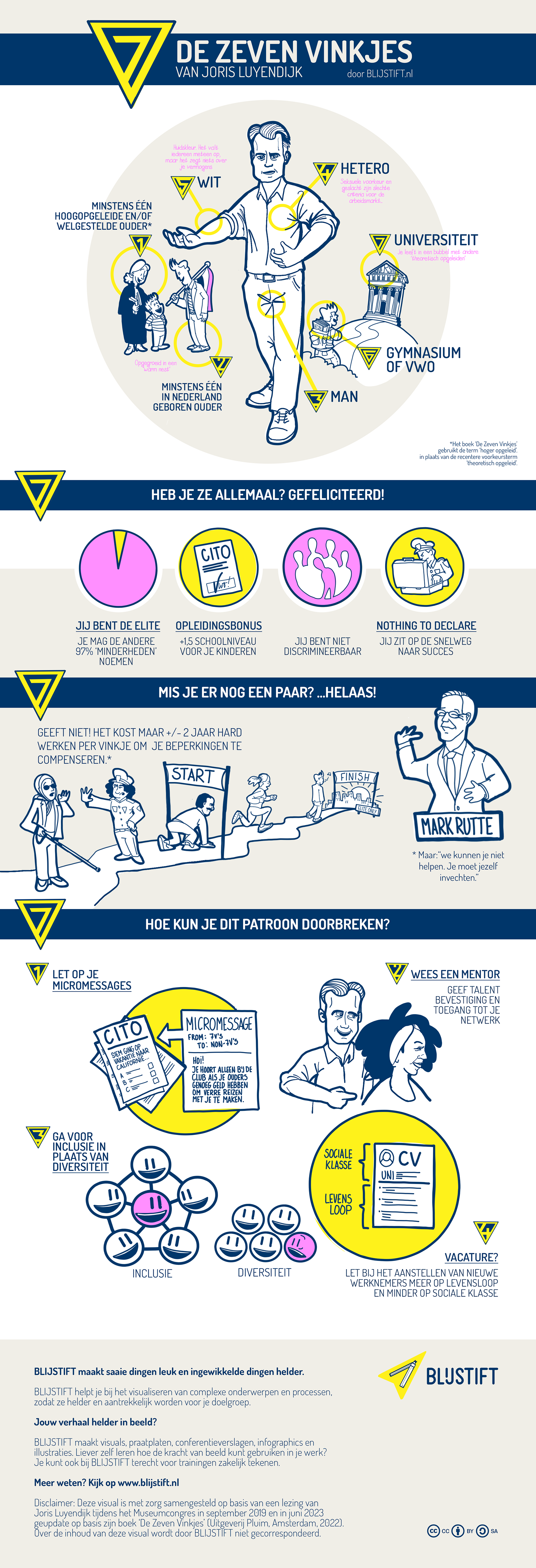 Volgens Luyendijk liggen de 'zeven vinkjes' - witte, hetero mannen, met gymnasium of VWO diploma, universitaire opleiding en minstens één hoogopgeleide, in Nederland geboren ouder - mijlenver voor op de rest van de maatschappij. Ze (of beter -we-) vormen maar zo'n 3% van de bevolking, maar vormen sinds het begin van deze eeuw de onomstotelijke bovenlaag. Koning Willem-Alexander, Mark Rutte, Thierry Baudet, en zo ongeveer alle (start-up) CEO's behoren tot het clubje volgens Luyendijk. Door hun monopolie op wat gezien wordt al de 'standaard', zijn ze ondiscrimineerbaar. Sterker nog, de 'andere' 97% zijn de 'minderheden'.