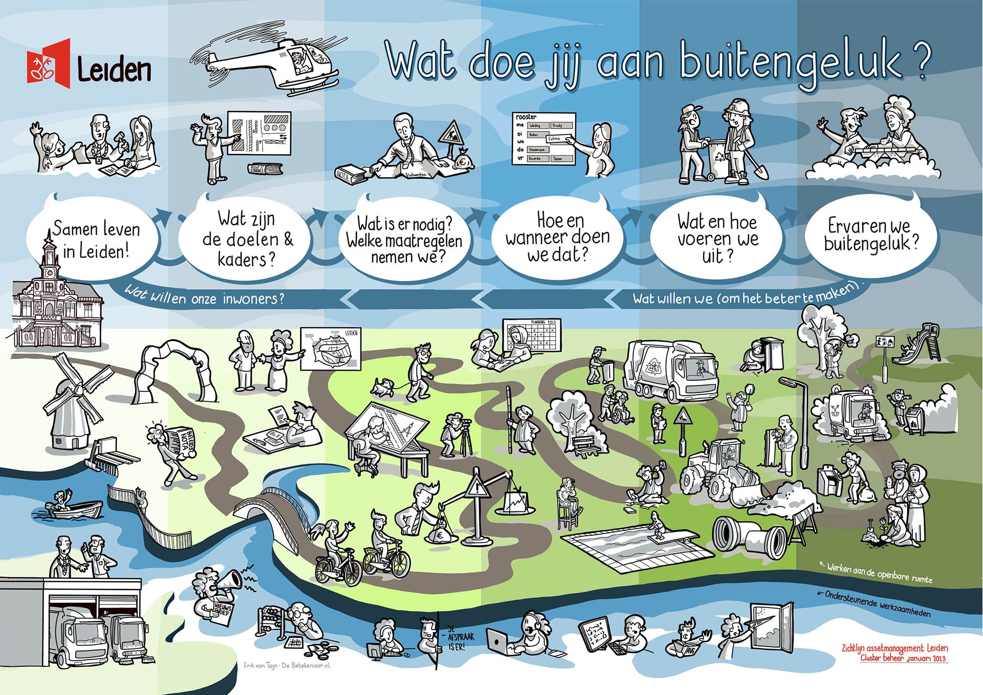 . Blijstift maakte namens De Betekenaar een praatplaat die ingezet wordt als hulpmiddel tijdens gesprekken met mensen die een rol vervullen in deze keten. Zo wordt voor iedereen, van burger tot gemeenteraadslid en van vuilnisman tot procesmanager, duidelijk waar zij passen in het grotere plaatje.