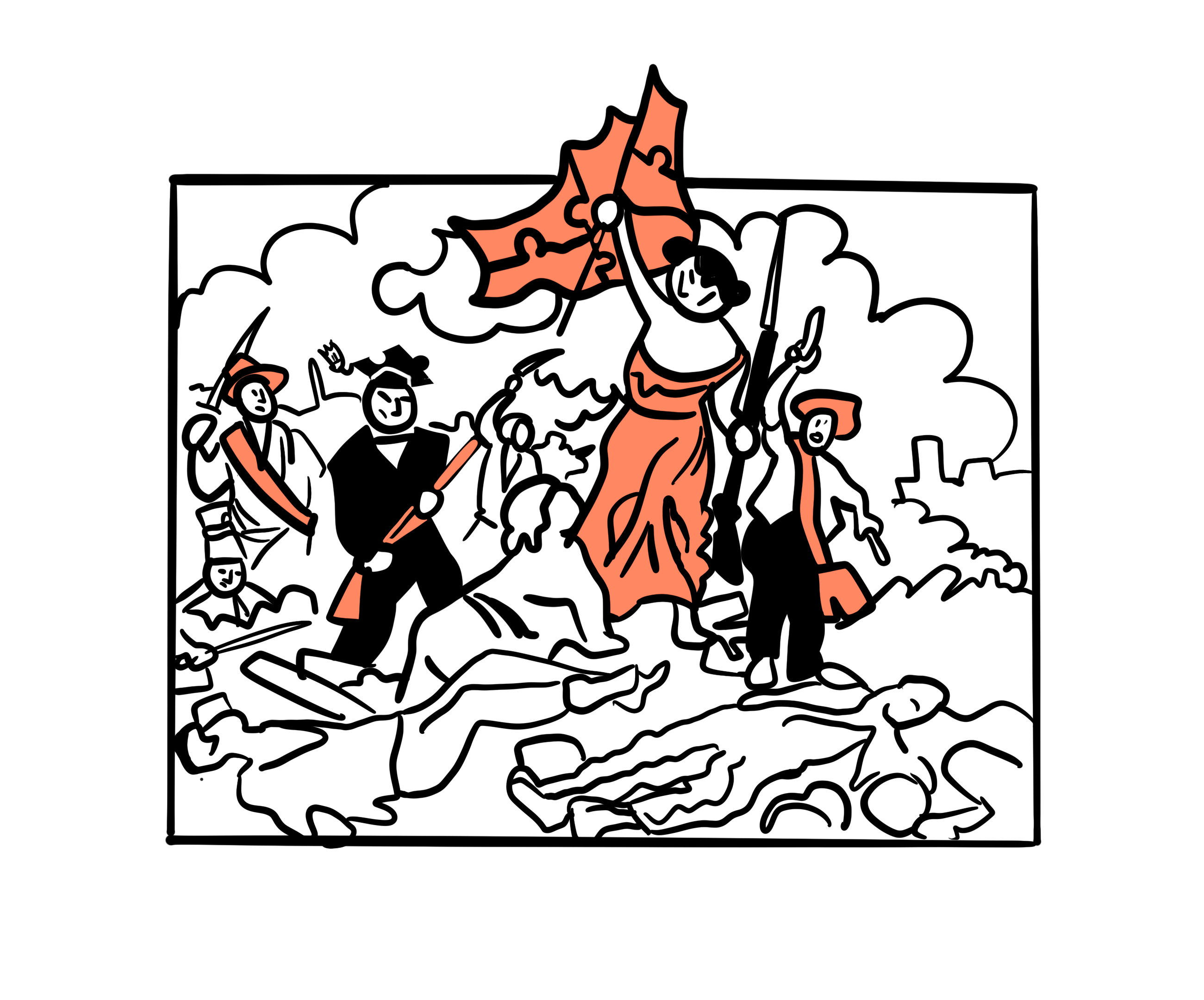 De Universiteit Wageningen (WUR), De Technische Univetsiteit Eindhoven (TUe), Universiteit Utrecht (UU) en het Universitair Medisch Centrum Utrecht (UMCU) gaan de handen ineenslaan. BLIJSTIFT maakte een serie illustraties voor deze alliantie. UMCU onderzoeker Ronald van den Bos had al een hoop goede ideeën klaarliggen: van parelsnoeren met onderzoeksthema's tot een activistisch ingestoken omwerking van Eugène Delacroix' wereldberoemde schilderij La Liberté guidant le peuple (vert: 'De vrijheid leidt het volk') uit 1830.