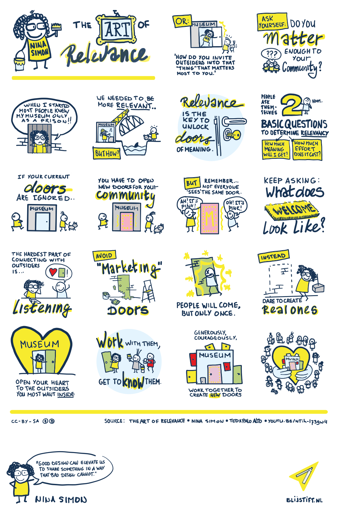 Gelukkig is daar zelfverklaard cultureel activist en museumdirecteur Nina Simon, bekend van haar blog Museum 2.0. Zij herinnert ons er in haar boek The Art of Relevance (2016) aan dat je je 'hart moet openen voor de buitenstaanders die je het allerliefst binnen wil hebben'. Ze strijdt in het boek (en in de praktijk met haar #ofbyforall beweging) voor het aanknopen van oprecht contact met de mensen die door de deur van je museum (kunnen) komen. Ze daagt iedereen uit om 'met hen te werken, hen te leren kennen, om vrijgevig en moedig samen te werken aan nieuwe deuren'. De deuren zijn hierbij Simon's metafoor voor alle mogelijke manieren waarop je publiek met je instelling contact kan maken.