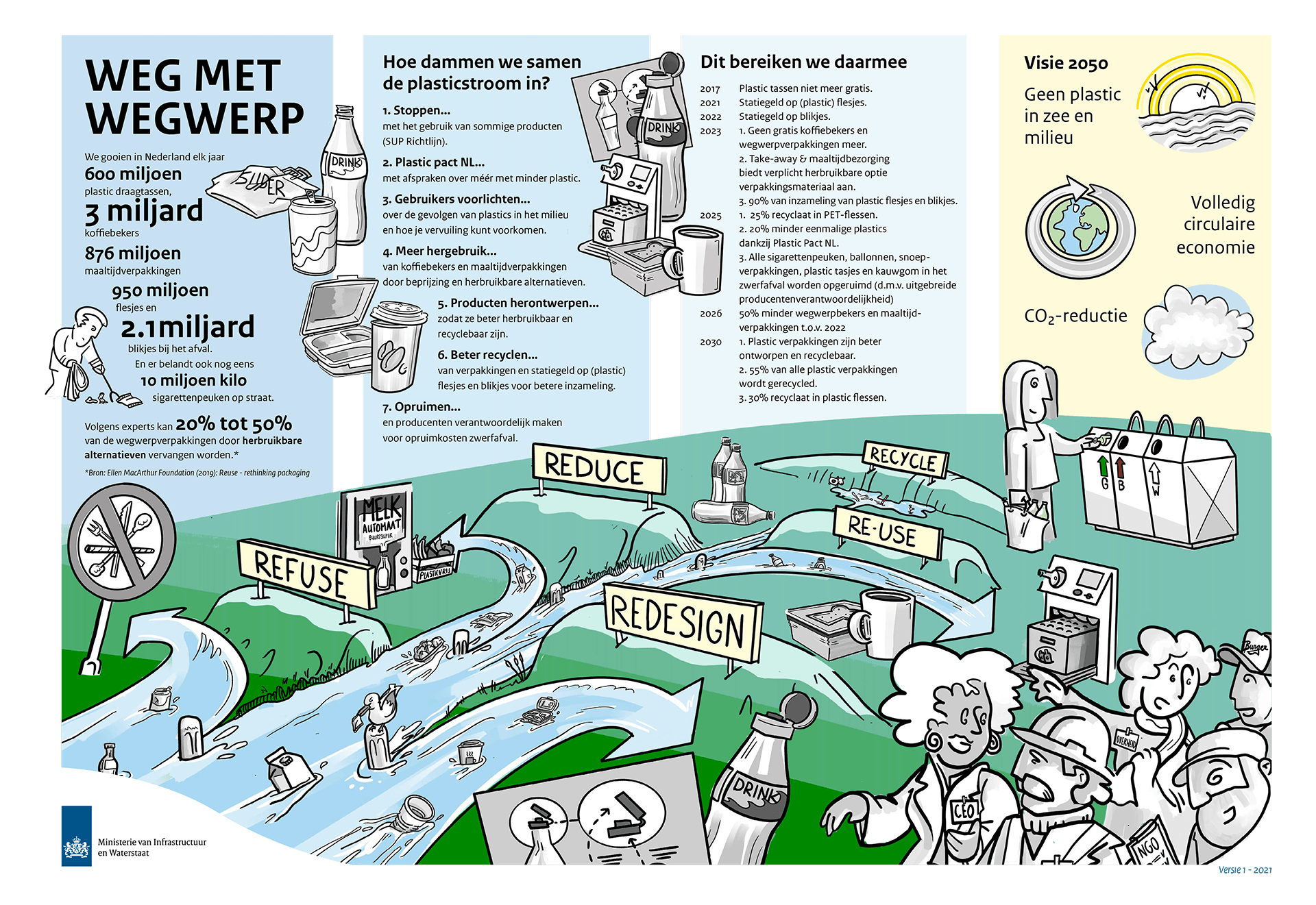 Hoe dammen we de plasticstroom in Nederland in? Neem die 2.1 miljard (!) blikjes die jaarlijks bij het afval gaan. Die ruimen zichzelf niet op. De minister Infrastructuur en Waterstaat heeft daarom besloten dat het statiegeld op blik er nu toch echt gaat komen. Maar er is meer te doen, en het ministerie werkt al geruime tijd aan een totaalplan. En Blijstift mocht daar - samen met de Design Innovation Group - een praatplaat over maken.